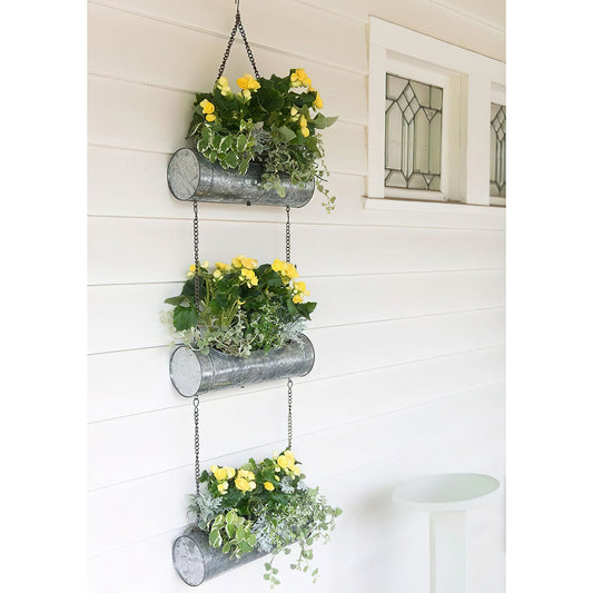 36 Inch 3 Tier Hanging Planter, Galvanized Metal With Chrome Chain, Silver Finish