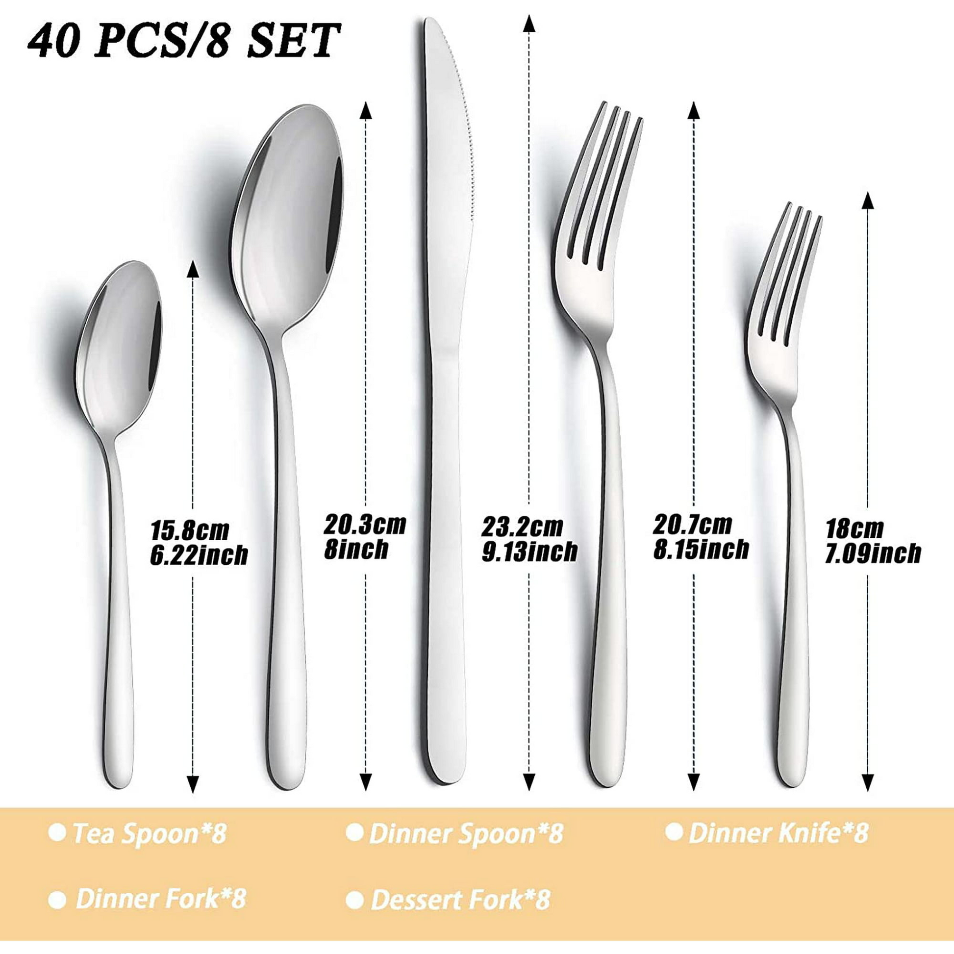 The good set of silverware can enhance the dining experience. If you are looking for a simple and classic cutlery set, then you have come to the right place! You won't regret taking this stainless steel flatware sets and serving food with them. The bestdin polish stainless steel flatware set will stand out in any tabletop setting! This attractive flatware set includes 8 dinner spoons, 8 dinner knives, 8 dinner forks, 8 salad forks, 8 teaspoons, and service for 8. The 40 pieces flatware set is great for everyday use. The sleek, classic lines of the design are so wonderful. This set can look laid back and cool with casual white plates. What we love about this refined collection is that it's dishwasher safe, so no pretense here. You can use it for special occasions and every day as well. It's absolutely a good silverware set to serve a family, entertaining guests or hosting a party, holiday meal, wedding, etc.This model is classic. It can be an accessory to any beautiful dinnerware that you have. Well-balanced and ergonomically designed. Every detail has been carefully polished, delicately designed, and produced. This promises to become your dinner plate's best companion!