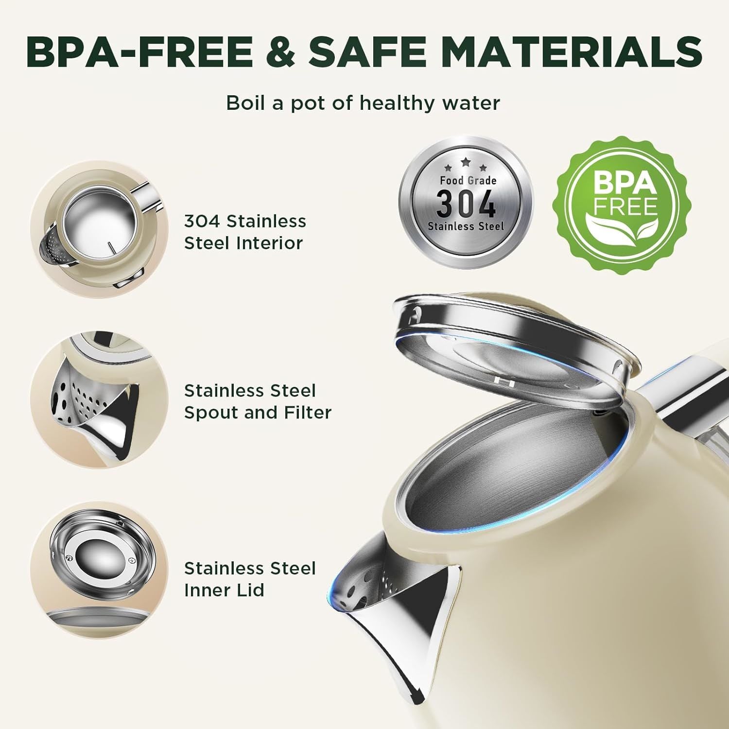 THE PUREST WATER: The KOIOS 1500W(120V) electric kettle is made of 304 stainless steel and all parts that come in contact with the water are BPA-free. It provides you and your family with the safest and freshest drinking water. The food grade stainless steel electric tea kettle and exquisite craftsmanship greatly enhance the durability and safety of the kettle.