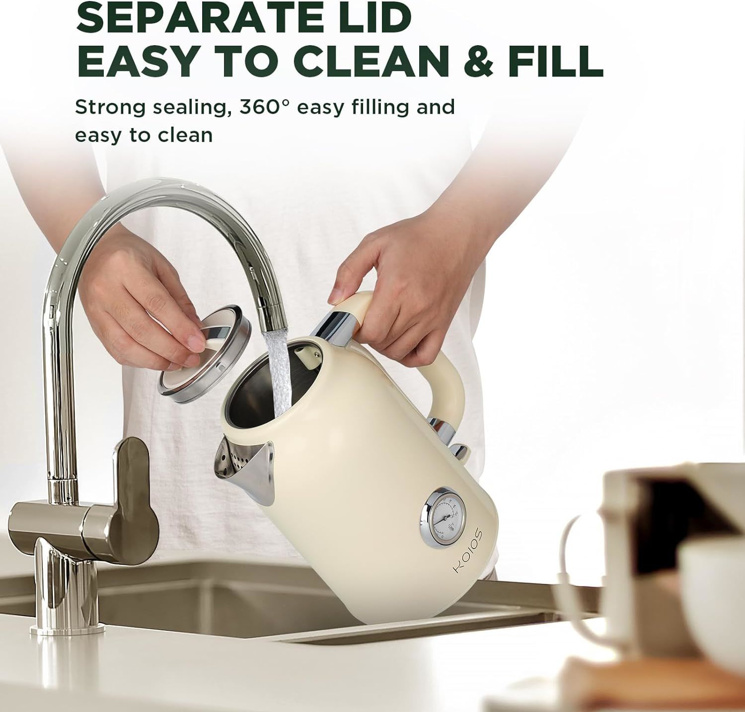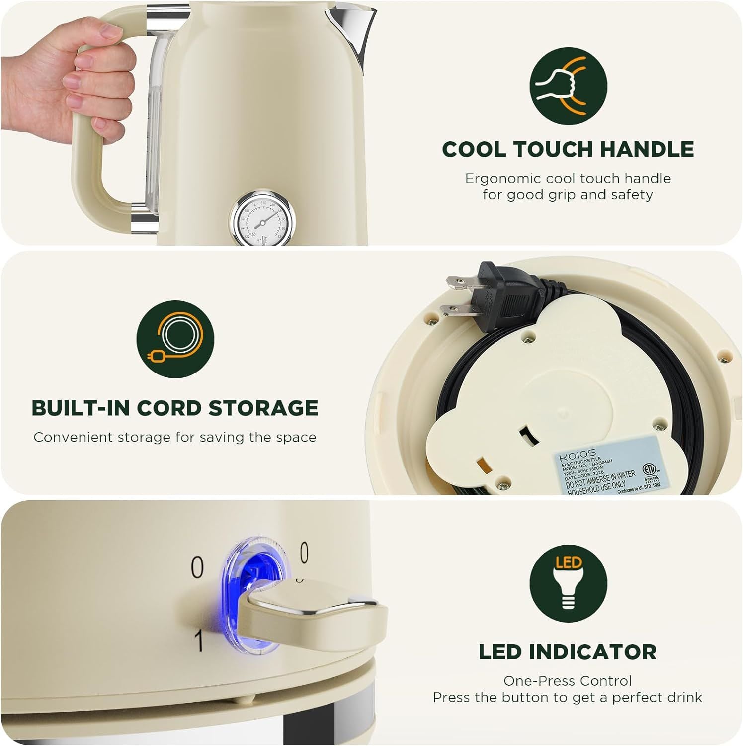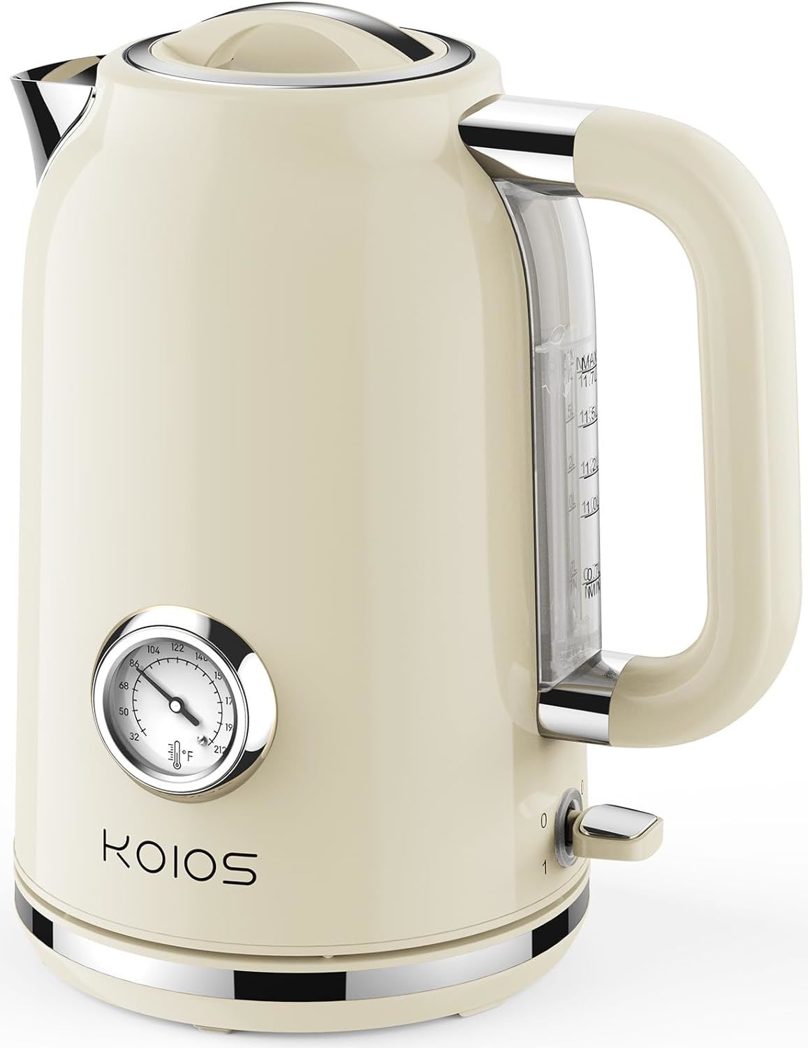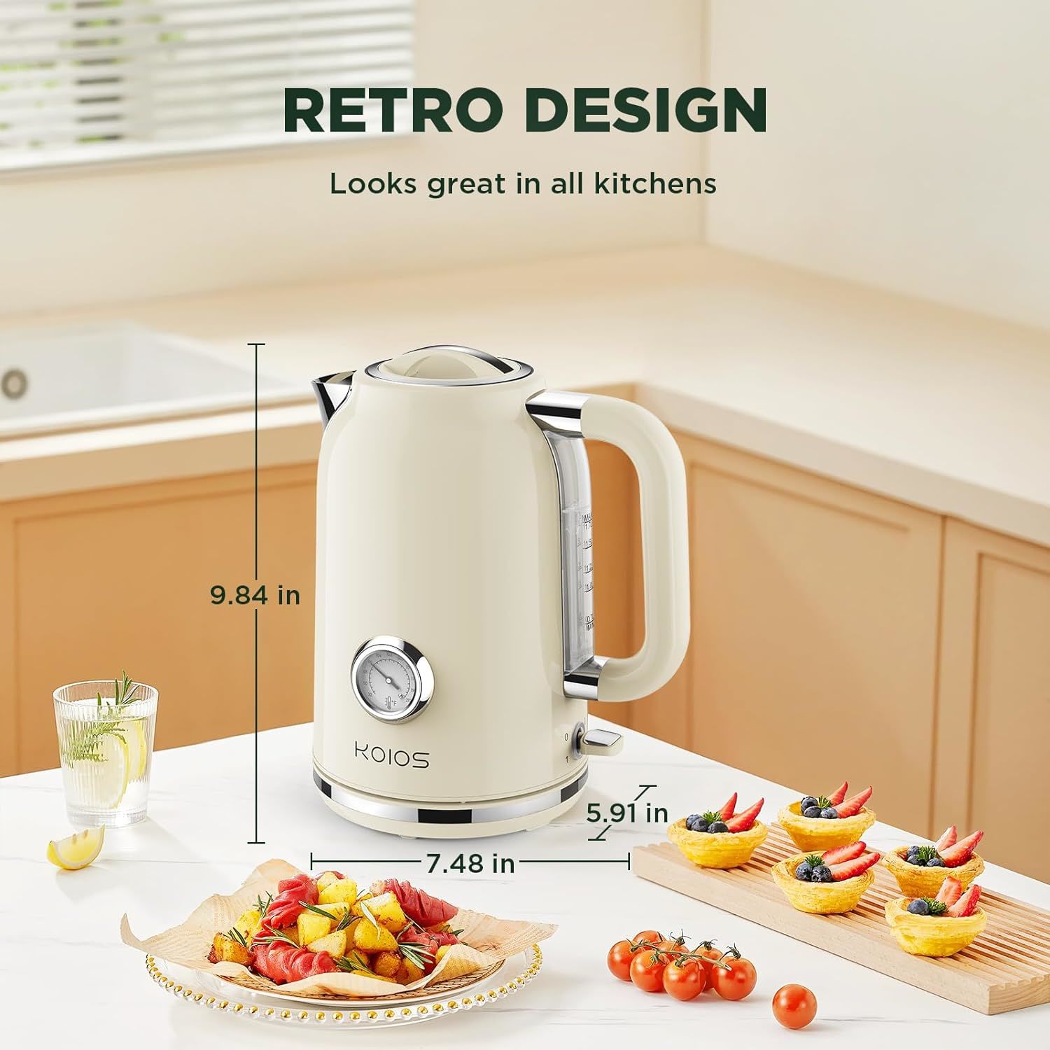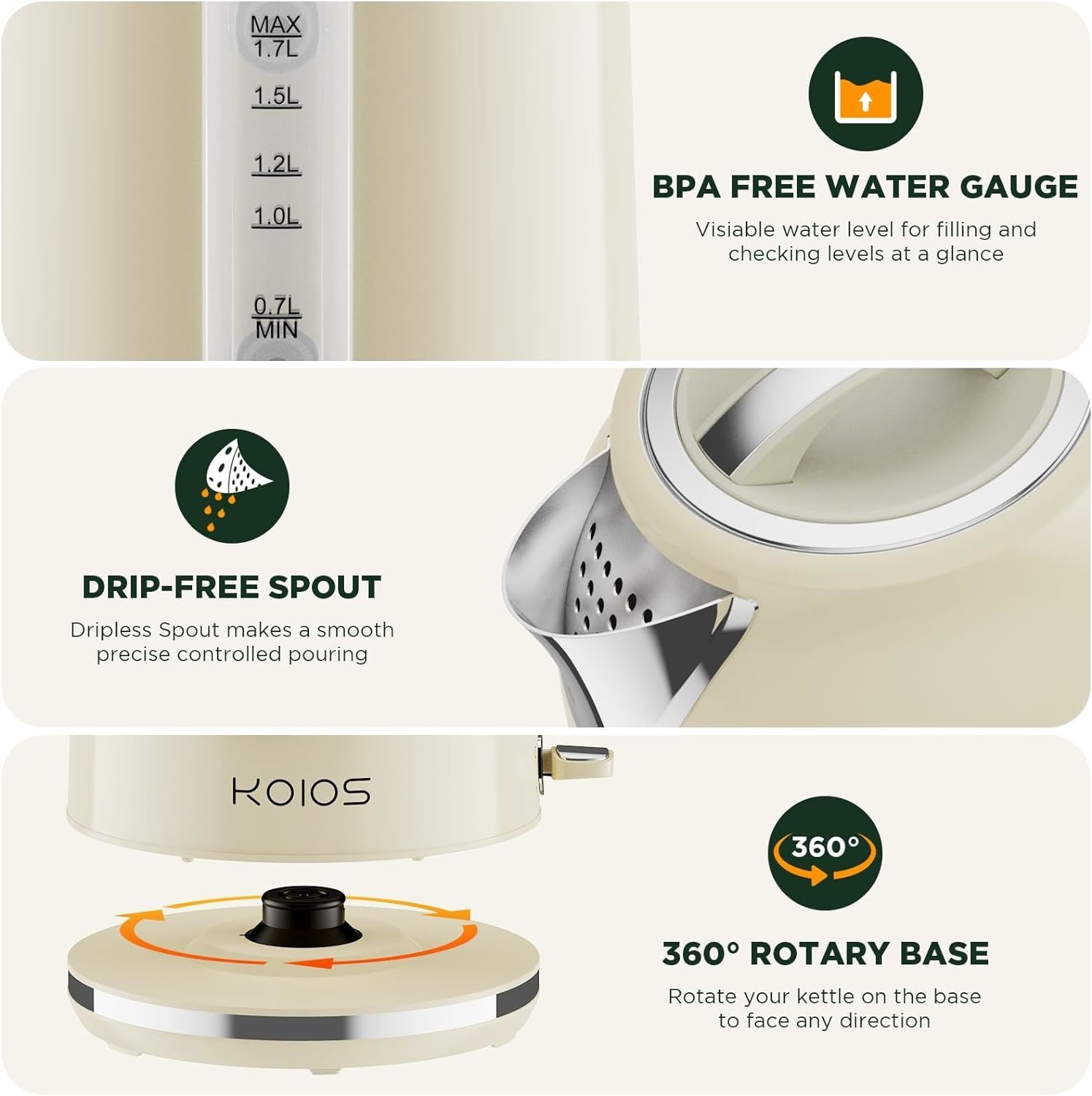 Electric Tea Kettle with Thermometer, KOIOS 1.7L 1500W BPA-Free Stainless Steel Fast Water Boiler with LED Indicator, Cordless Electric Tea Pot, 360° Rotation,Auto Shut-Off & Boil-Dry Protection