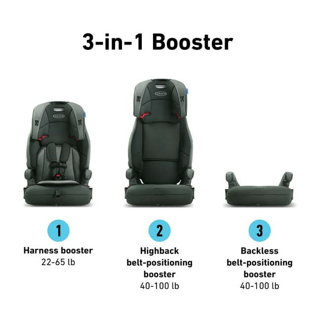 Grows with your child from forward-facing harness (22-65 lb) to highback booster (40-100 lb) to backless booster (40-100 lb)