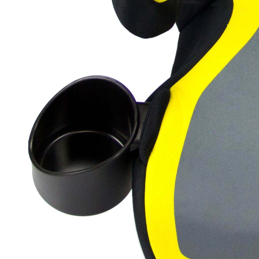 Integrated cup holder can hold a beverage, snack, or small toy