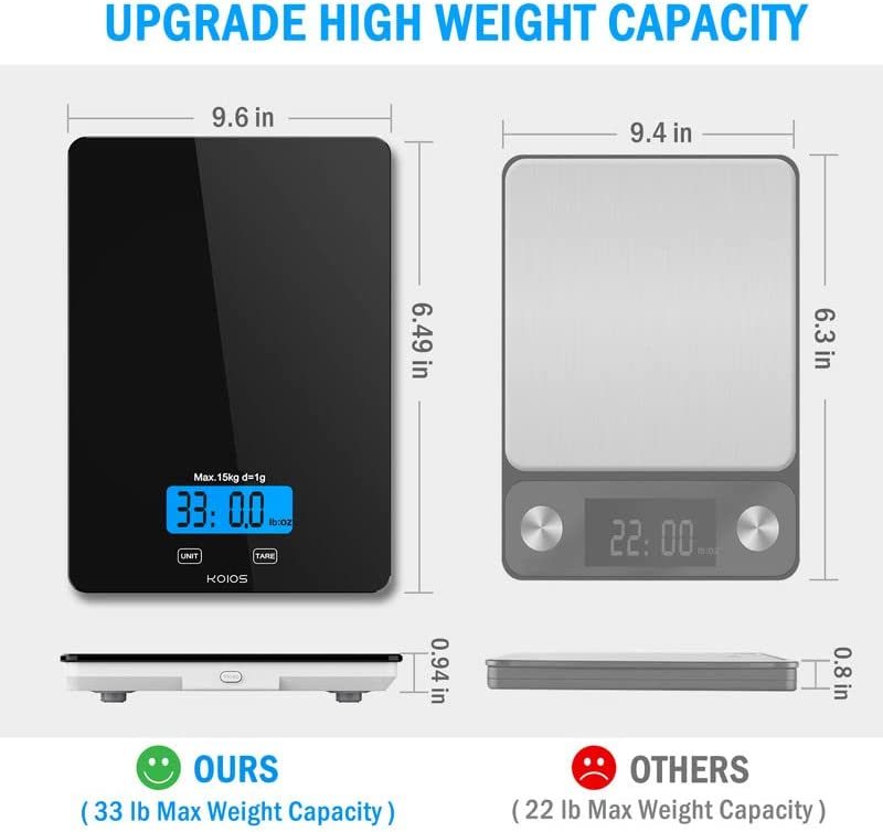 6 Weight Units & Easy Tare: KOIOS digital food scale with built-in four high-precision load sensors can easily access and display measurements within a second, it can weigh foods up to 33lbs (15kg), while the min weight is 1g/0.1oz. 6 units of measurement and convention [g, kg, oz, lb:oz, ml, ml (milk)]. The Tare function subtracts the weight of the plate or container, easy to get accurate readouts of ingredients