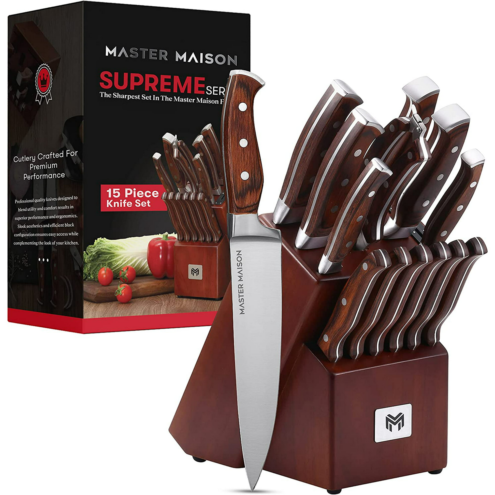 Master Maison 15-Piece Premium Kitchen Knife Set With Block | Master Maison German Stainless Steel Knives With Knife Sharpener & 6 Steak Knives (Walnut)