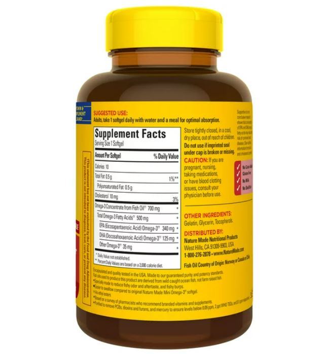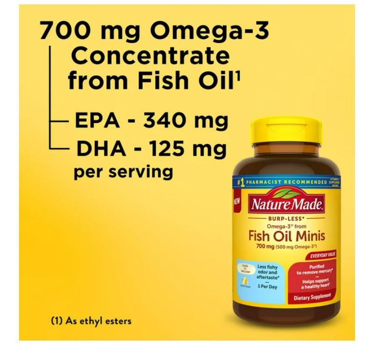 One daily Fish Oil Nature Made Omega 3 (1) mini softgel provides 340 mg of EPA and 125 mg of DHA to support a healthy heart