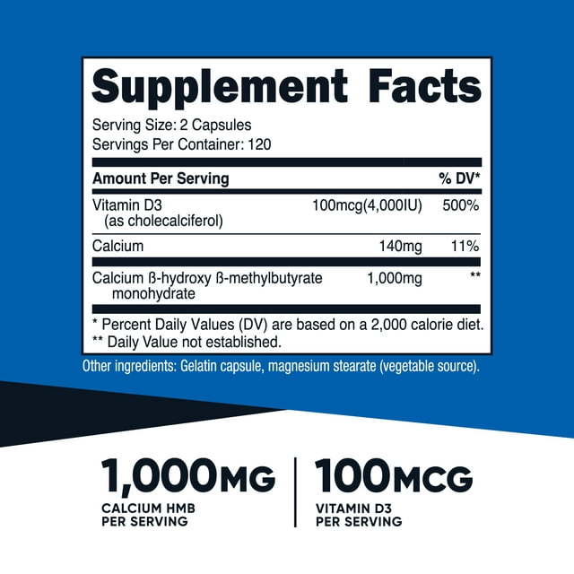Nutricost's HMB and Vitamin D3 Supplement contains 240 capsules for 120 servings. Each serving contains 1000mg of HMB (Beta-Hydroxy Beta-Methylbutyrate) and 100mcg (4000IU) of vitamin d3. Nutricost, located and headquartered in the USA, only uses the best ingredients to ensure maximum quality and to help you feel your best! By keeping our supplement recipes simple and clean, you get the best experience possible with Nutricost. Our supplements are manufactured in a GMP-compliant and FDA-registered facility; and each batch of every product is tested by independent, ISO-accredited laboratories.