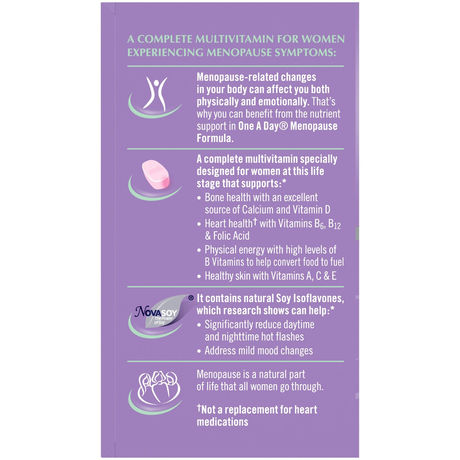 One A Day Women's Menopause Formula offers key benefits in a convenient tablet. One A Day Menopause Formula is a complete multivitamin with natural Soy Isoflavones to help address some menopause-related symptoms such as hot flashes and mild mood swings.* One A Day Menopause Multivitamin offers key nutrients to help support bone health.* This daily multivitamin contains Vitamins A; B6; B12; C; D; and E; Soy Isoflavones; Thiamin; Niacin; Riboflavin; Folic Acid; Pantothenic Acid; Calcium; Magnesium; Zinc; Copper; Manganese; Molybdenum; Biotin; Iodine; Selenium; and Chromium. One A Day Women's Menopause Formula is formulated to support menopause symptoms; bone health; physical energy by helping convert food to fuel; skin health; and heart health(1)*. Adult women should take one tablet with food. One a Day Multivitamins can provide nutritional support that you and your family may need at every life stage. (1) Not a replacement for heart medications.